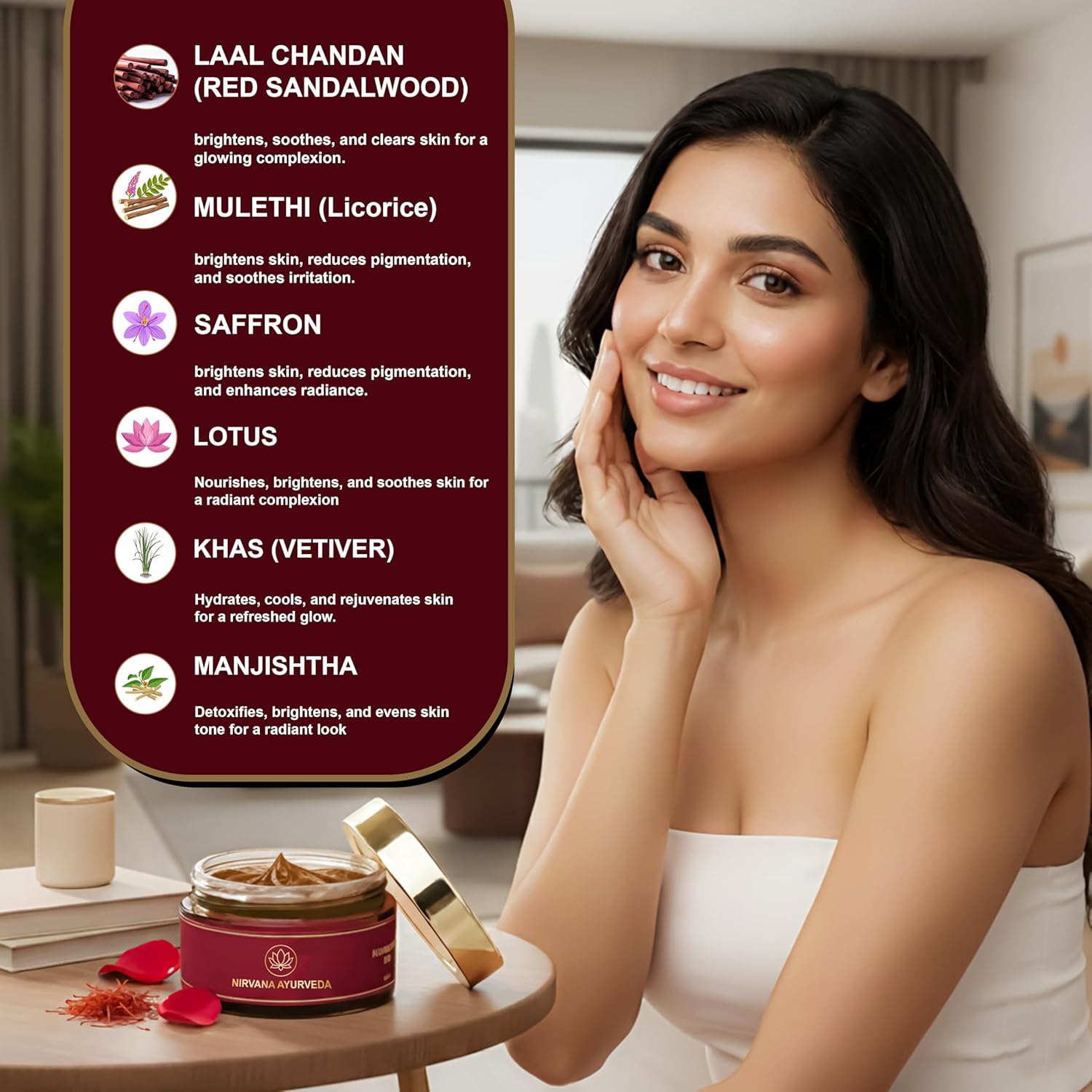 Infused with Saffron & Sandalwood: Brightens skin, evens tone, and reduces pigmentation.